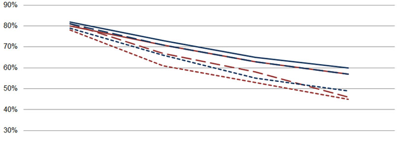 The red lines indicate survey respondents who were women, the blue is for men. Solid lines indicate marriages that involved no cohabitation before the wedding day; the dashed lines indicate couples who were engaged before they moved in together; and the dotted lines are couples that moved in together before they were engaged or married. Just from the data, one might be tempted to conclude that men have longer-lasting marriages, but obviously, every line on the graph corresponds to one man and one woman. Gender should therefore make no difference.
