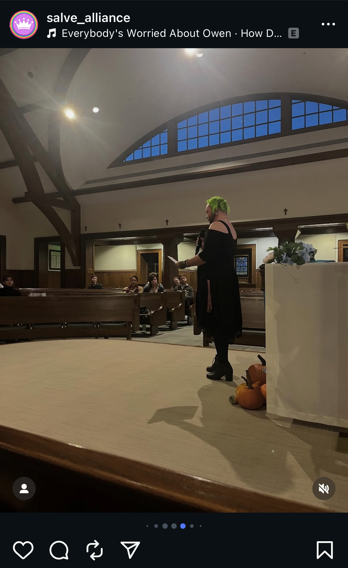 The event, organized by the student group Salve Alliance with support from the university’s LGBTQ+ Center and the Office of Spiritual Life, featured speakers, readings and a display of the transgender flag draped across the chapel’s altar. Photos posted by the group show pumpkins and pride-flag decorations placed before the sanctuary, as well as a speaker addressing attendees from the front of the chapel.